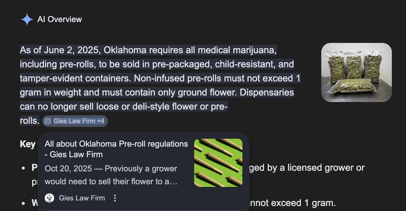 By building a consistent content strategy around regulatory updates, practical legal guides, and the specific questions potential clients are actually searching for, Gies is now positioned as a leading authority in Oklahoma's cannabis legal landscape. They're owning search results in the places where people are actually looking for legal help. And that content is surfacing in AI-generated answers too.